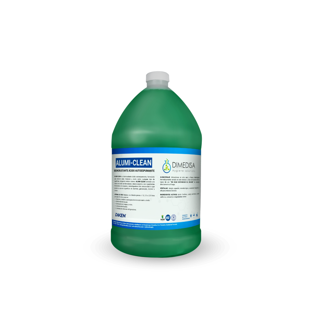 ALUMI-CLEAN es desincrustante ácido autoespumante, formulado para remover sales minerales y óxido sobre cualquier tipo de superficies, incluyendo metales suaves. ALUMI-CLEAN contiene una mezcla de ácidos abrillantadores y desincrustantes con ingredientes fomentadores de espuma y amortiguadores de corrosividad lo que permite su uso en superficies de aluminio, galvanizado, mármol y azulejo.